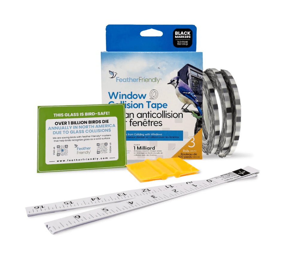 This DIY kit includes three roll of high-contrast black markers spaced for optimal visibility to birds, two paper measuring tapes, a squeegee, clear installation instructions, and a bird-safe sticker — everything you need to start protecting your winged visitors quickly and confidently.